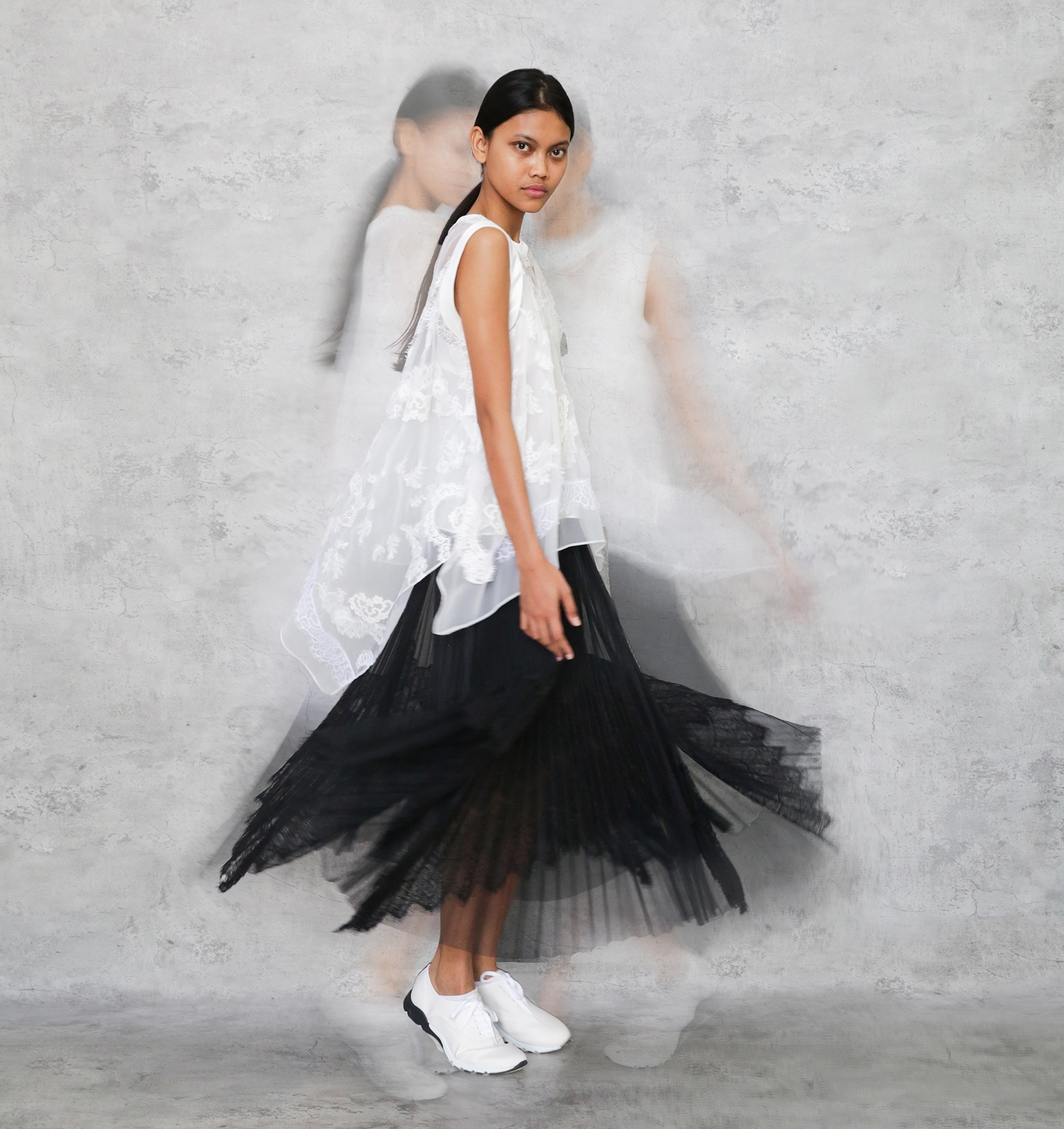 Progressive elegance with Comme des Garçons Comme des Garçons line. Statement design in monochrome hues